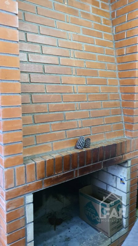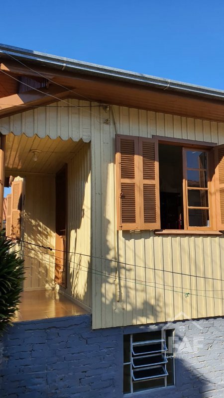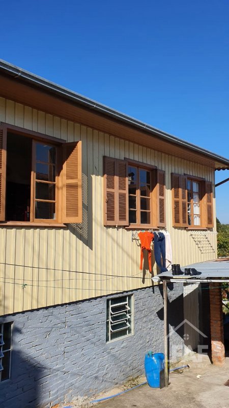 Descrição › Casa mista composta de três dormitórios, sala, cozinha, banheiro, despensa, varanda e lareira.