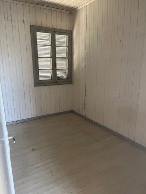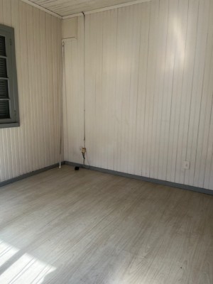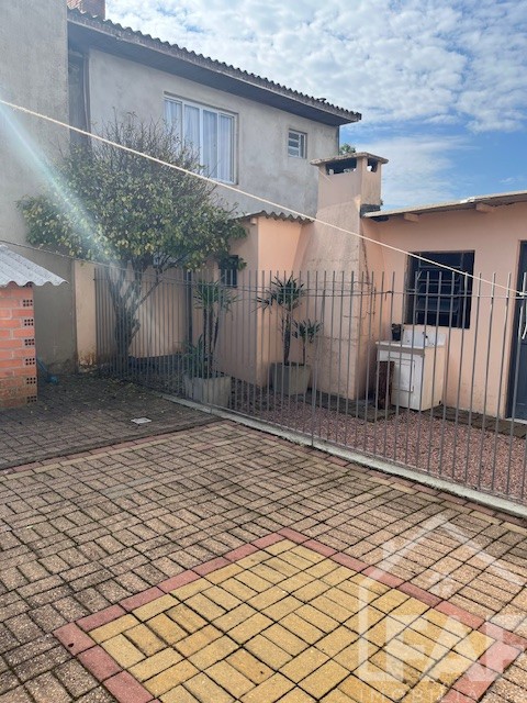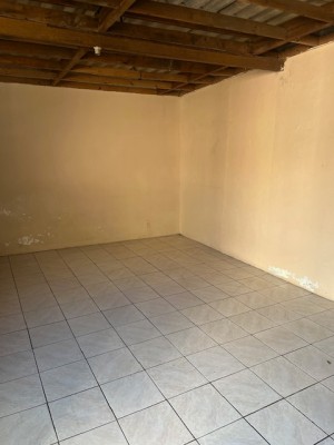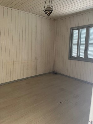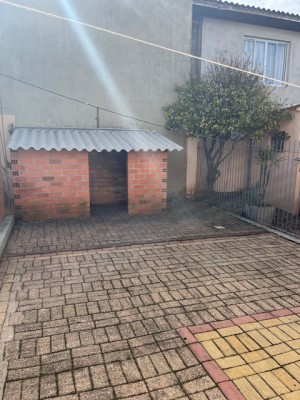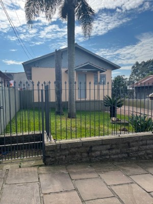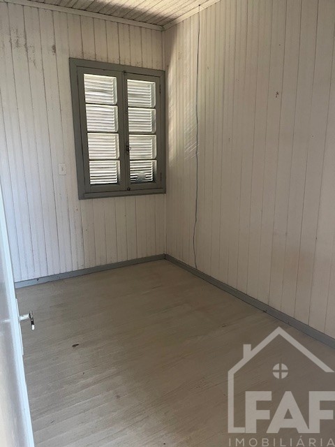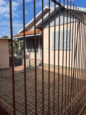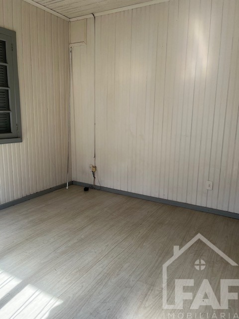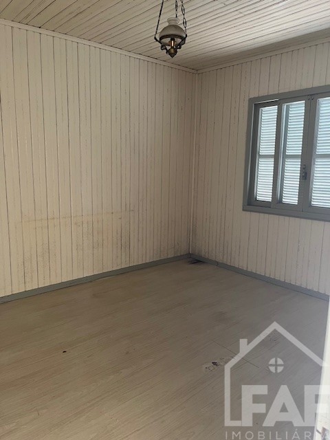 Descrição › Casa de alvenaria com divisórias e assoalho em madeira com três dormitórios, sala, cozinha, área de serviço e garagem com churrasqueira.