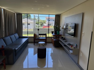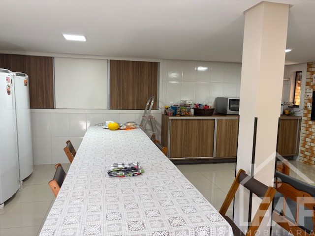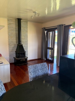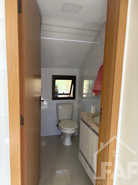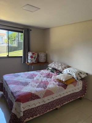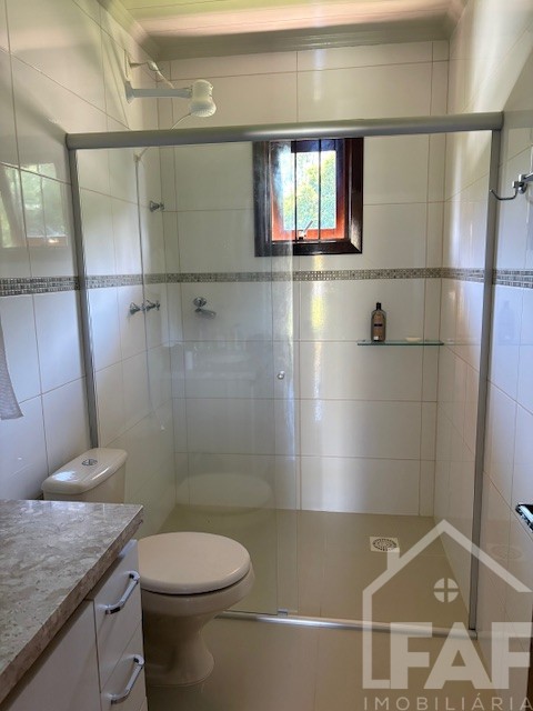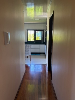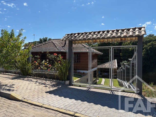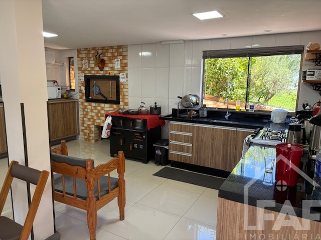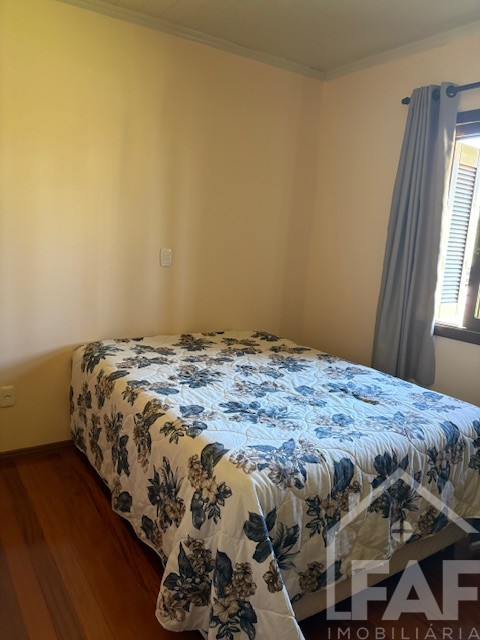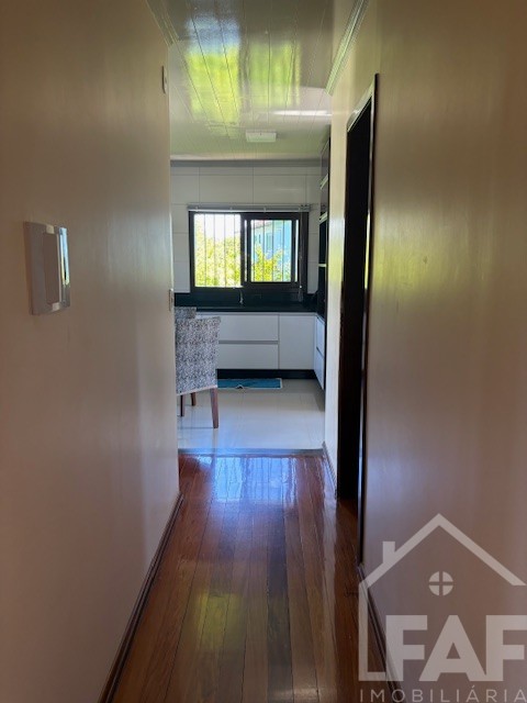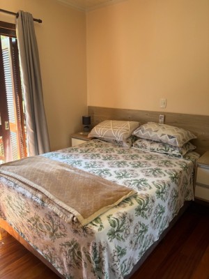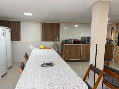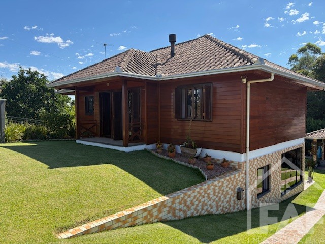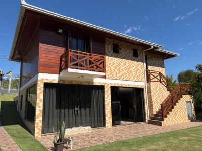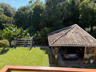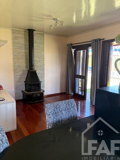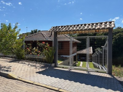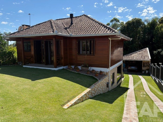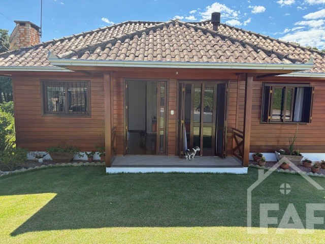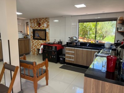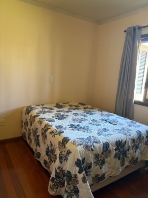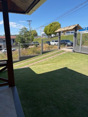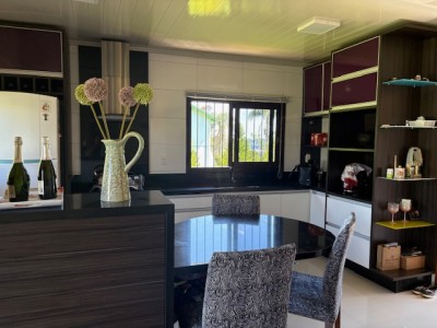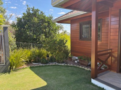 Descrição › Linda casa de madeira (grápia), semimobiliada, três dormitórios sendo uma suíte com sacada aberta, dois banheiros mobiliados, duas salas, lavabo, duas cozinhas mobiliadas com churrasqueira, área de serviço e uma garagem coberta.
